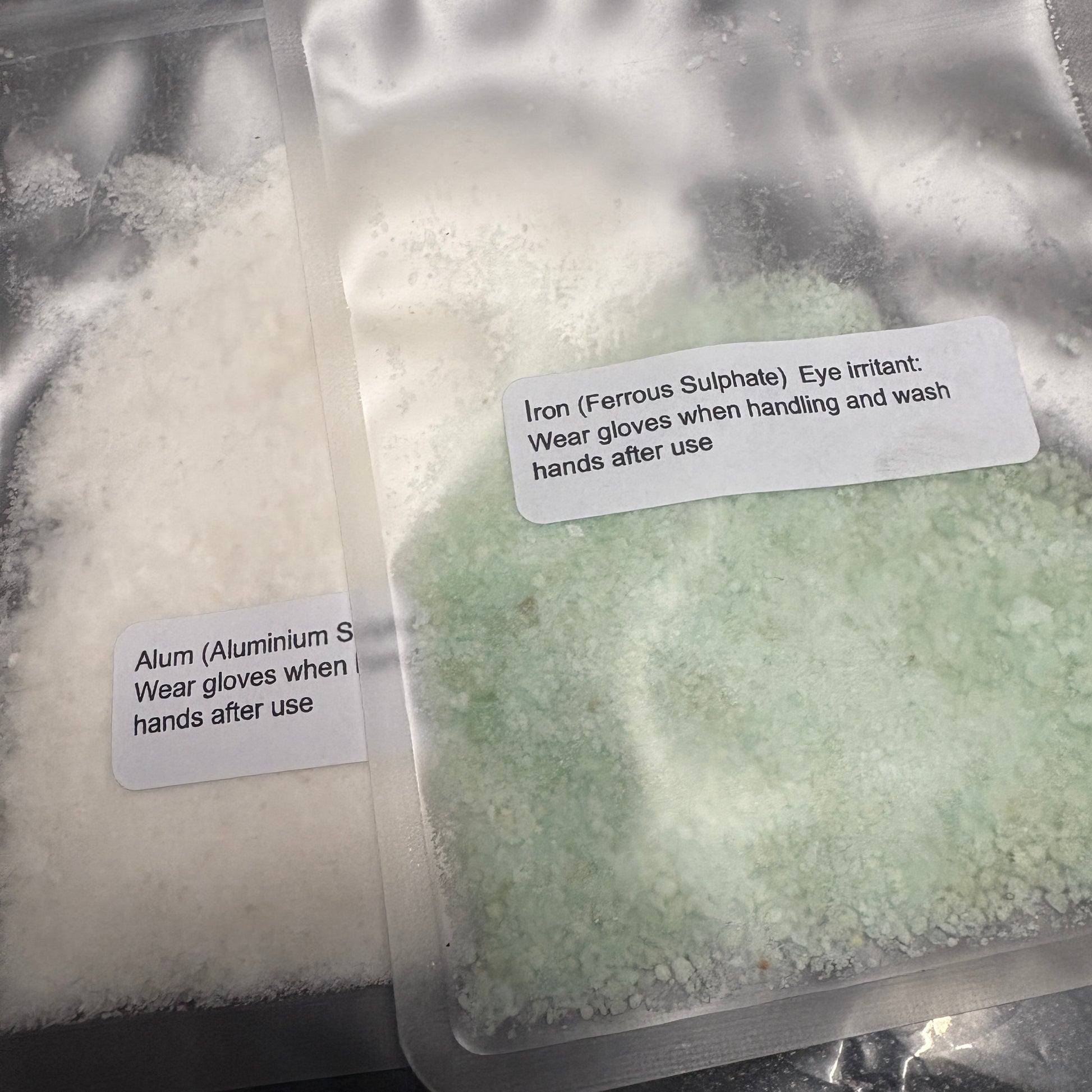 If you need extra iron (ferrous sulphate) or alum (aluminium sulphate) mordants, We offer them in packs of 50g.