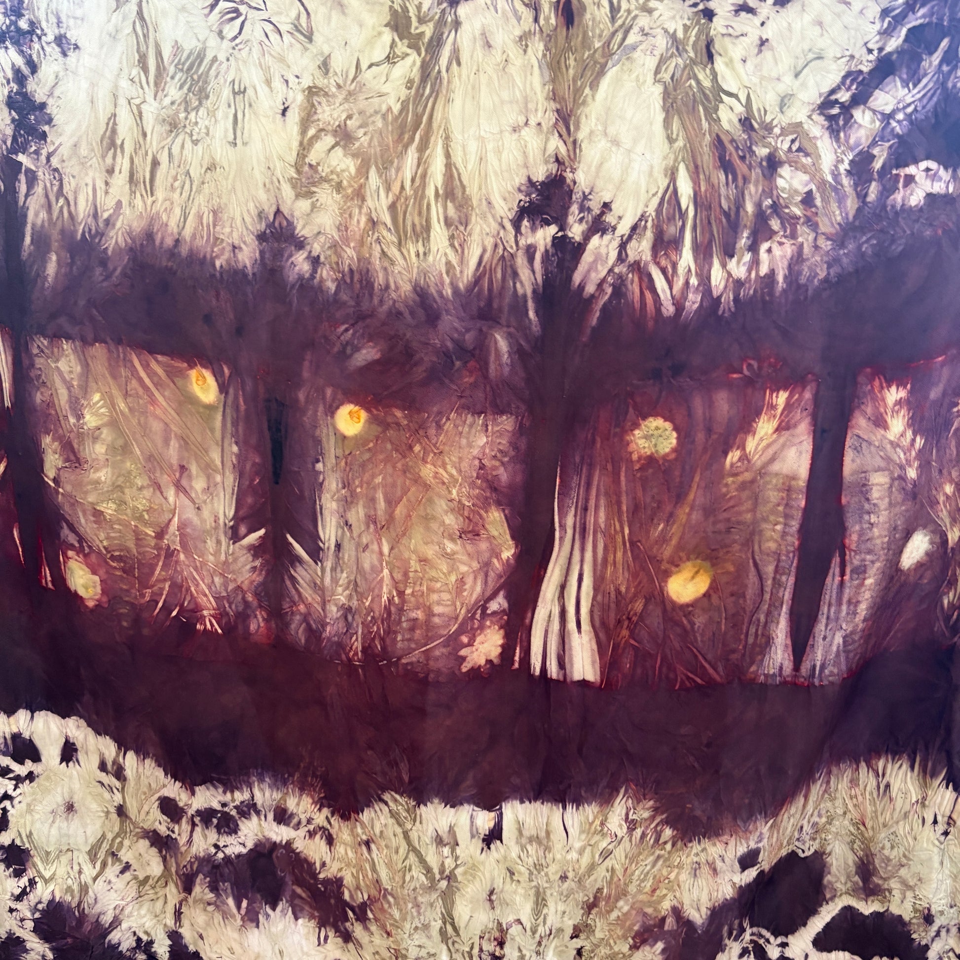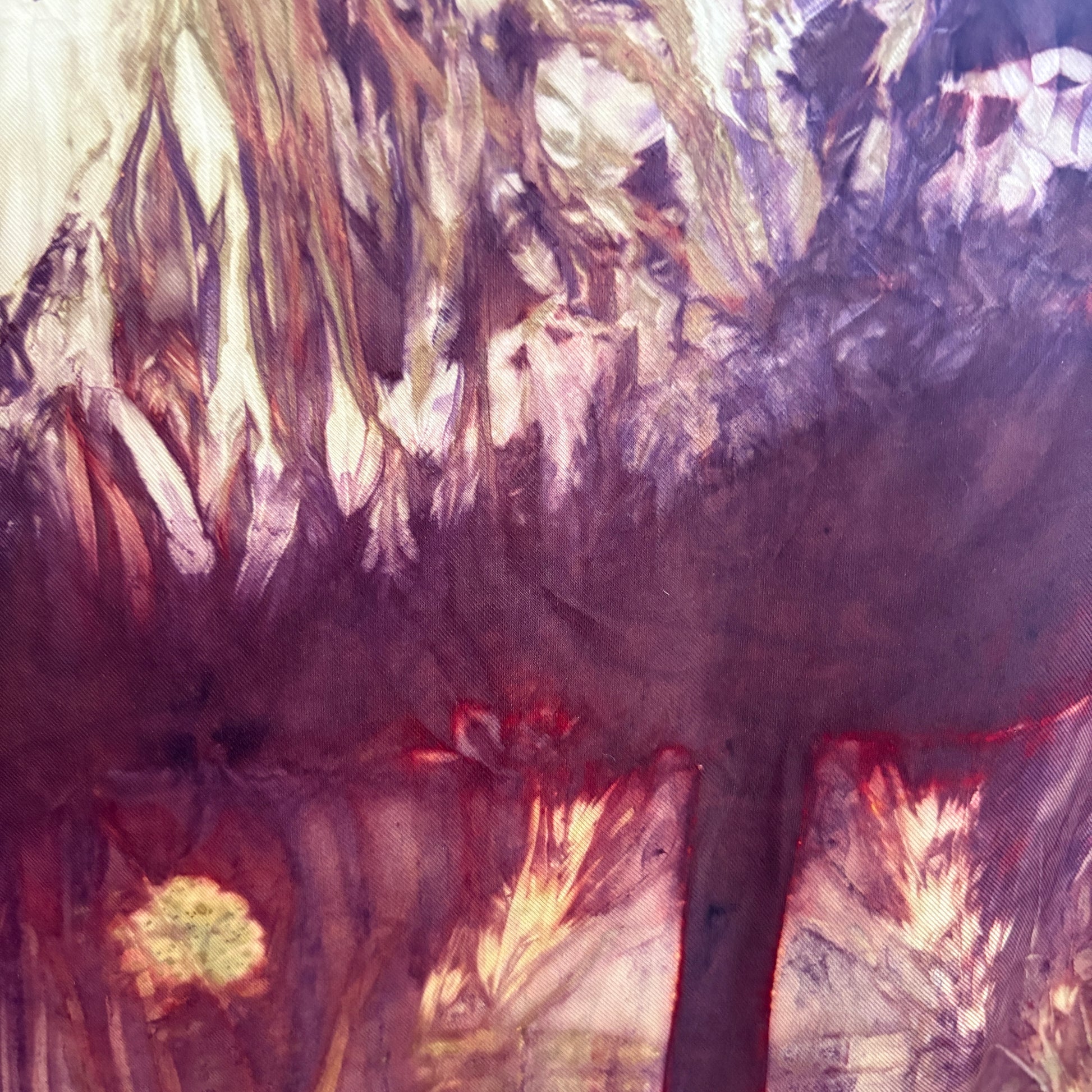 It has been ecoprinted in a marigold and iron dyebath, with paper daisies, kangaroo grass and grevillea. Check the product images for the video with tips on different ways to style a square scarf.